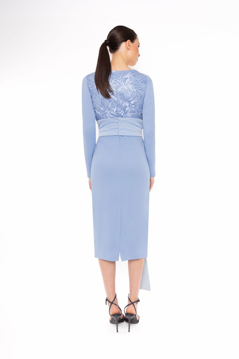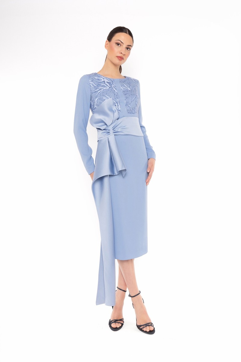 Este é um vestido de cerimónia midi tem um desing elegante, corte reto com mangas compridas e no peito uma renda bordada e lantejoulas. Possui um cinto largo com um laço estruturado na cintura, que termina na lateral com uma faixa fluida que proporciona um toque sofisticado e ajuda a defenir a silhueta.