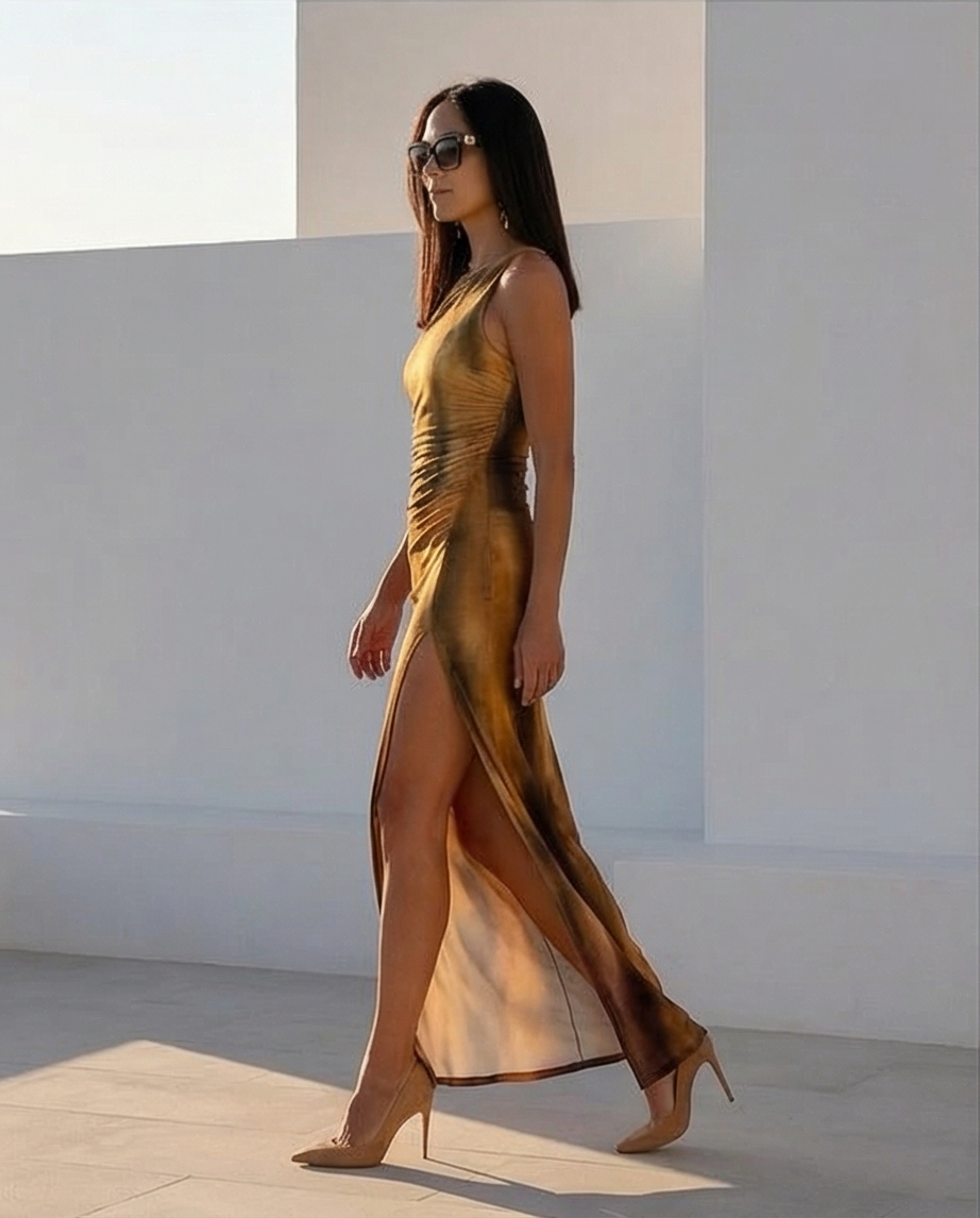 Mulher com vestido comprido e óculos escuros junto a piscina em ambiente de pôr do sol Vestido Sol 139,40 € Desconto de %. Partilhar Tamanho S / M Comprar Contactar Este vestido destaca-se pelo seu desing elegante e refinado, tem um padrão abstrato inspirado no pôr do sol em tons de amarelo, laranja e dourado. Tem um decote bonito que valoriza o colo é de alças finas e com uma racha alta e ousada. Perfeito para eventos noturnos,ocasiões especias que pedem uma presença marcante.