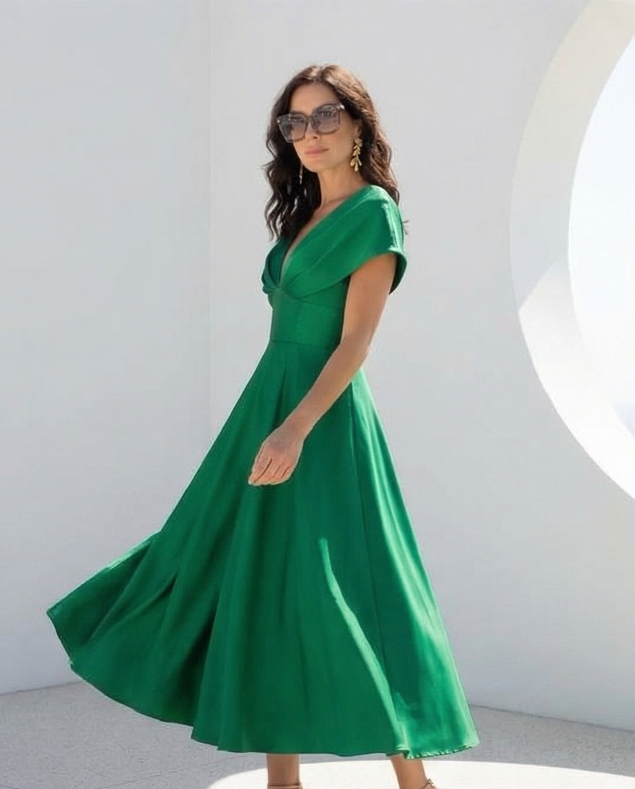 • Vestido midi verde com decote em V e saia ampla, óculos de sol e brincos dourados.
