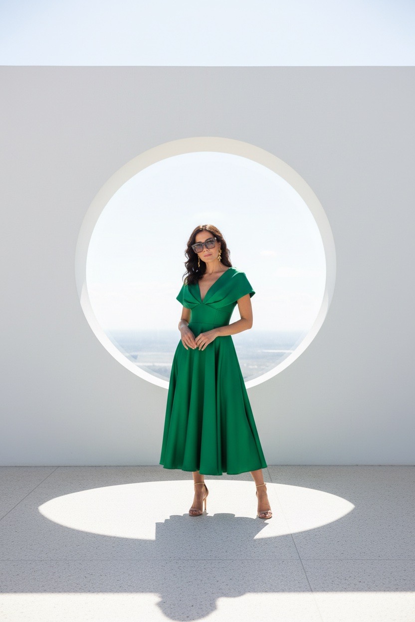 • Mulher de vestido verde midi com decote em V e mangas curtas junto a parede branca com círculo