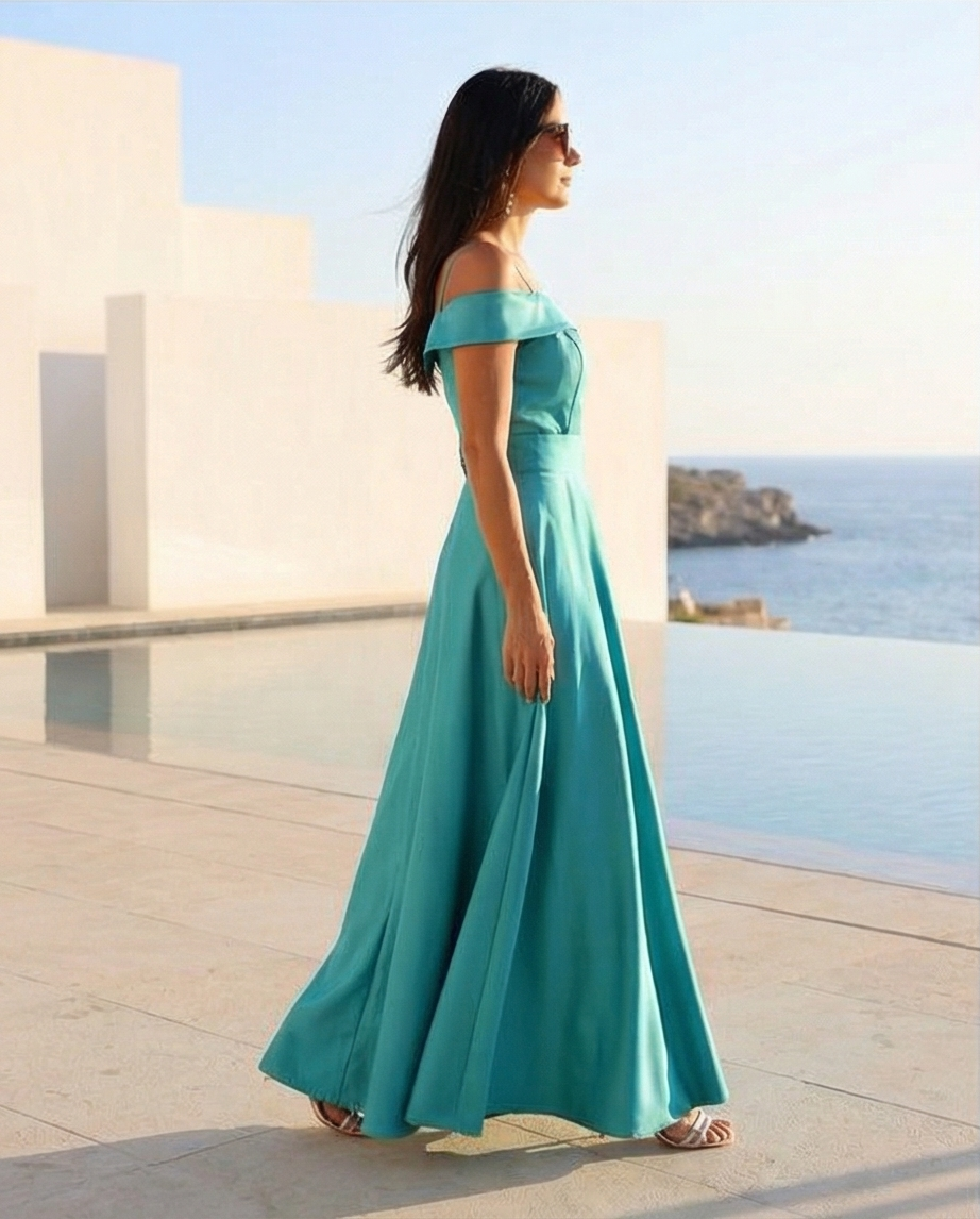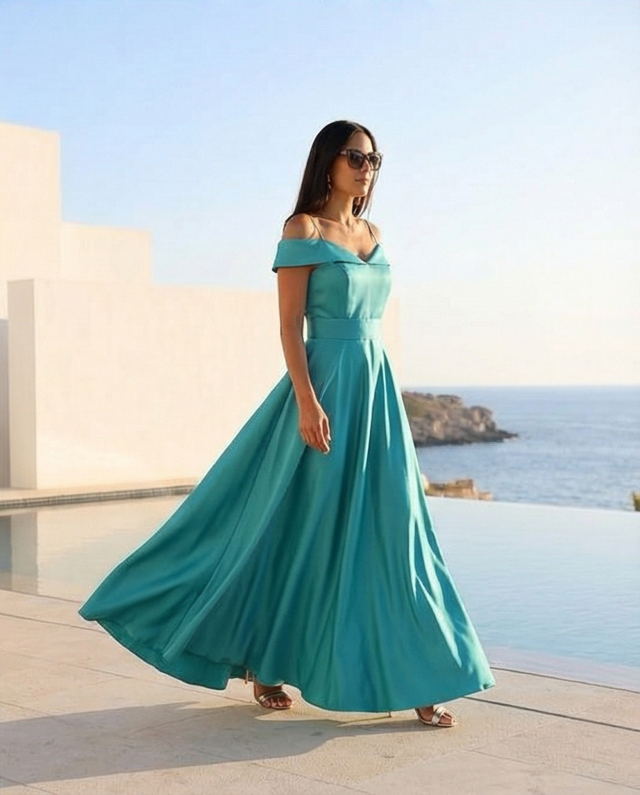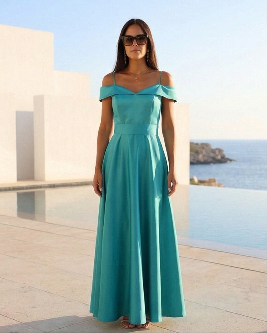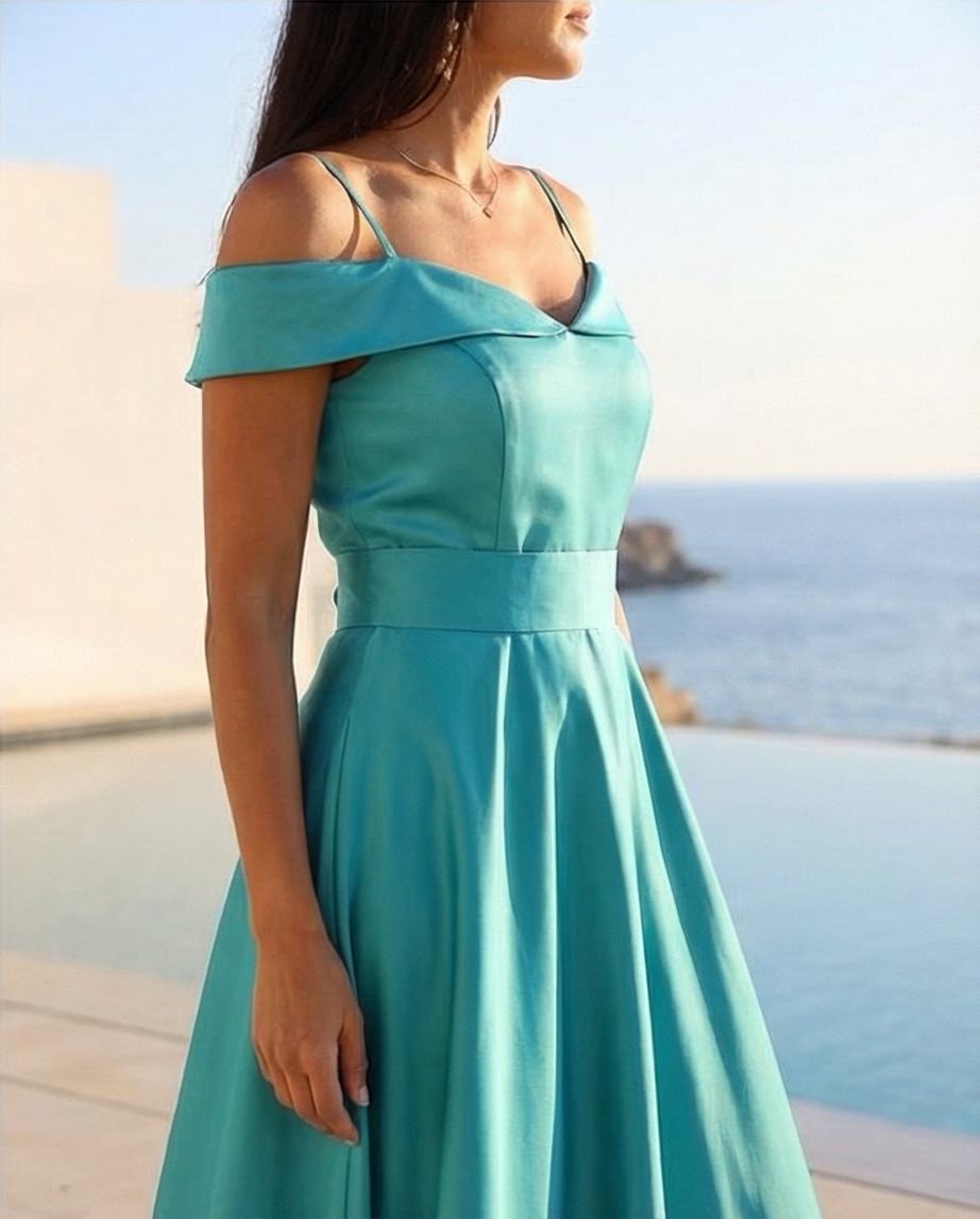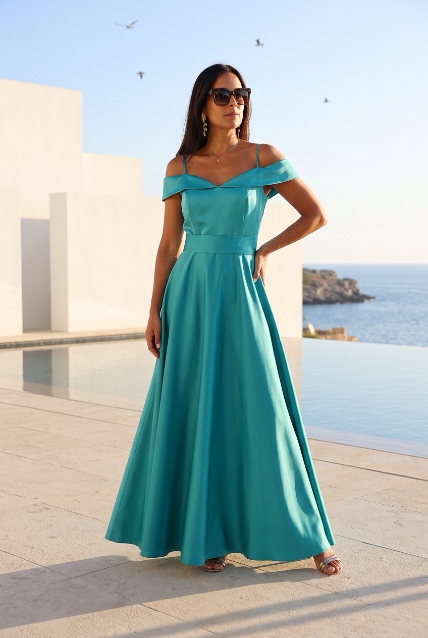 Vestido Yara 209,40 € Desconto de %. Partilhar O produto encontra-se sem stock. Este vestido tem o decote de ombro a ombro com alças finas de suporte. É do estilo princesa que acentua a cintura e abre numa saia fluida. Ideal para cerimónias, feminino, marcante inesquecível. Cor : Azul turquesa